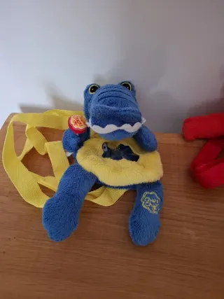 Set di due zaini per bambini della marca Chupa Chups. Prezzo originale 10€ ciascuno, ora a 6€. Ideale per bambini piccoli o collezionisti. - Zaino coccodrillo blu con dettagli gialli. - Zaino scimmia rosso con dettagli gialli. - Chiusura con cerniera e finestra per vedere l'interno.