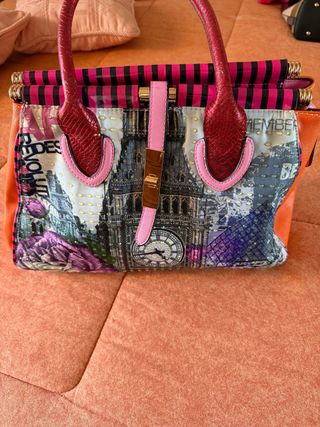 Borsa shopping con stampa raffigurante Londra e dettagli colorati. - Manici in pelle rossa. - Dettagli in pitone. - Chiusura con fibbia. - Fodera interna a righe. - Inserti glitterati.