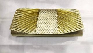 Elegante pochette color oro, perfetta per cerimonie ed eventi speciali. - Misure: 10 cm di altezza e 25 cm di larghezza. - Design raffinato e accattivante. - Chiusura a calamita (da verificare). - Materiale: similpelle (da verificare).