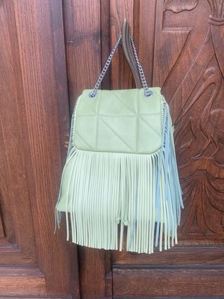 Zaino alla moda con frange e una doppia tasca. Perfetto per aggiungere un tocco di stile. - Dettagli trapuntati sulla patta. - Tracolla a catena. - Design con frange decorative.