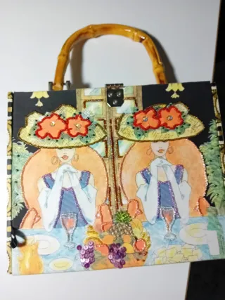 Elegante clutch rigida da donna, un pezzo unico con una stampa vivace. - Manico in bambù - Dettagli ricamati e perline - Chiusura a scatto metallica - Fantasia double face,due lati,due fantasie differenti