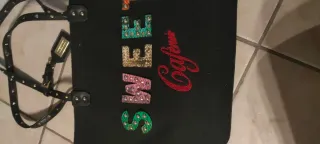 Borsa in tessuto nero con dettagli scintillanti. 42 cm x 30 cm 11 - Scritta SWEET decorata con borchie. - Logo Cafènoir ricamato in rosso. - Manici in ecopelle nera con borchie. - Targhetta logo in metallo dorato.