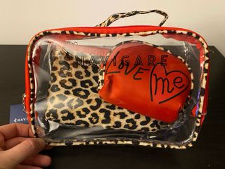 Set di tre pochette Navigare con fantasia leopardata e dettagli rossi. - Una pochette trasparente con zip rossa e bordi leopardati. - Una pochette interna in tessuto con fantasia leopardata. - Una pochette a forma di cuore rossa con scritta LOVE ME nera.