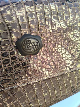 Elegante portafoglio da donna con finitura effetto coccodrillo. Colore oro e marrone. Dettaglio metallico frontale.