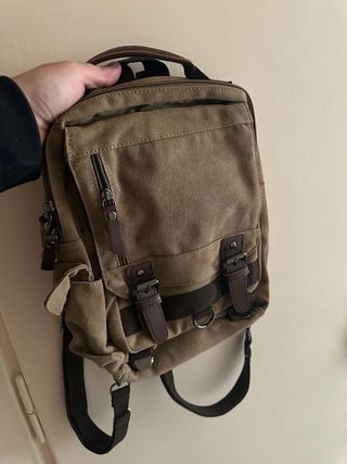 Zainetto in tela resistente, perfetto per le avventure quotidiane. Design pratico e versatile. - Materiale: tela resistente - Dettagli in pelle - Tasca frontale con zip - Tracolla regolabile