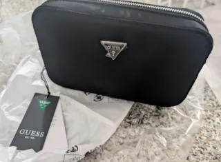 Pochette uomo Guess. Esterno in materiale ricilato. Chiusura con cerniera lampo. Metalleria color argento. 1 scomparto principale con zip in metallo. Nylon eco con finiture in nylon eco e minuteria in lega. Triangolo logo in metallo frontale. Dimensioni: Misure 22x14x5 cm. Lungo tirazip removibile Tracolla regolabile e removibile lunghezza ca. 110/130 cm. Composizione: 100% Poliammide.