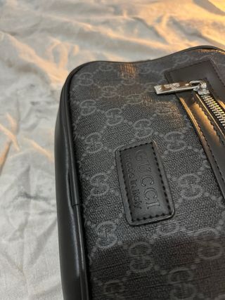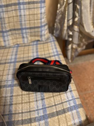 Marsupio da uomo, un accessorio pratico e di tendenza. - Design con monogramma GG. - Dettagli in pelle nera. - Tracolla regolabile con strisce rosse e blu.