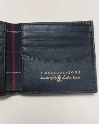 Portafoglio-porta carte Barbour da uomo, 100% pelle, nuovo ma senza scatola. - Design classico. - Interno con fodera a quadri. - Logo inciso in rilievo.