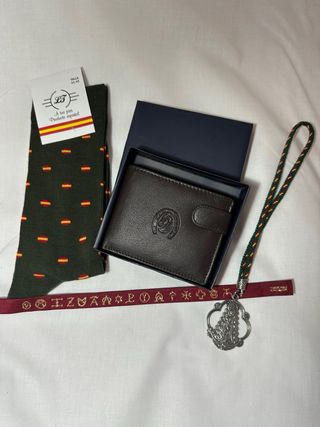 Set regalo per uomo con vari accessori. Portafoglio in pelle marrone con stemma, calzini verdi con design bandiere, dettaglio con simboli, ciondolo con figura religiosa.