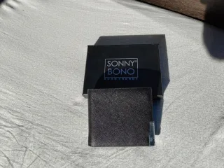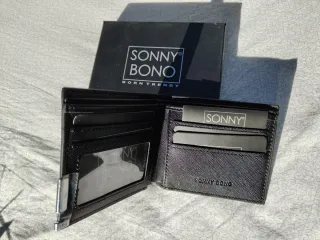 Elegante portafoglio da uomo Sonny Bono. - Design compatto e funzionale. - Dettagli metallici argentati. - Materiale testurizzato nero. Nuovo, mai usato, ancora nella scatola originale.
