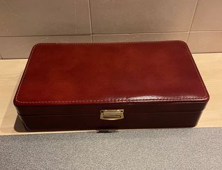Bello ed elegante Beauty case da viaggio da uomo in pelle color bordeaux con molti accessori. Nuovo, mai usato, completo di: portaspazzolino, portasapone, portaprofumo, spazzola, specchio, pettine, calzascarpe, forbici e limetta. Dimensioni: cm 28,5 x 15,5 x 6,5 h. Ottima idea regalo, perfetto per organizzare i tuoi accessori da toeletta. - Finitura in pelle bordeaux. - Interno foderato. - Scomparti interni per organizzazione. - Include accessori.