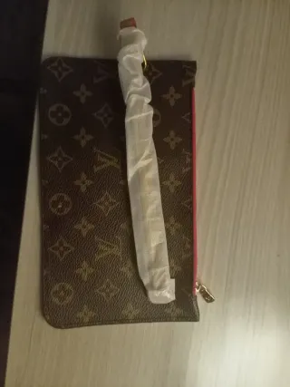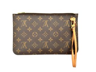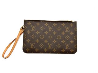 Louis Vuitton Neverfull Monogram Pochette, elegante e versatile. Realizzata in tela Monogram LV con cinturino da polso in pelle naturale, ideale come borsa a mano, clutch o pochette organizzatrice. Dimensioni 24 × 16 cm, con interno foderato in tessuto a righe e ampio spazio per gli essenziali. Buono stato, con lievi segni d'uso sui bordi che non ne compromettono la struttura. Un classico senza tempo di Louis Vuitton.