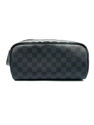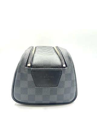 Il Necesser Louis Vuitton Toilet Pouch Dopp Kit in tela Damier Graphite è un accessorio pratico ed elegante, ideale per viaggi di lusso. Necesser Louis Vuitton di seconda mano con design sobrio e maschile. Misure circa 26,5 × 12 cm, perfetto per l'uso quotidiano o per brevi viaggi. Esterno in tela Damier Graphite e interno foderato in pelle nera con tasca piatta con cerniera. Ottime condizioni, con lievi segni d'uso all'interno, senza compromettere la funzionalità. Un classico senza tempo di Louis Vuitton.
