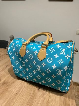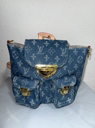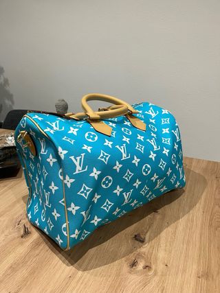 Borsa del marchio Louis Vuitton in toni blu e dorati. Design con monogramma. Tasche frontali con chiusura. Dettaglio di chiusura principale dorato.