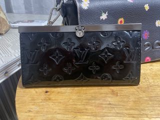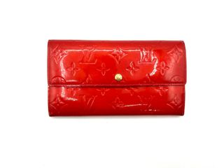 Portafoglio Louis Vuitton Sarah Vernis Monogram rosso, elegante e funzionale. Realizzato in pelle Vernis rossa con Monogram in rilievo e chiusura con bottone dorato. Dimensioni 19 × 11 cm. Interno ampio con scomparti per banconote, carte e chiusura a cerniera centrale. Buono stato generale, con segni visibili di utilizzo sulla parte posteriore esterna e interno ben conservato. Un classico senza tempo di Louis Vuitton.