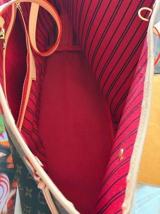 Borsa Louis Vuitton Neverfull GM. Modello iconico del marchio. Combinazione di colori beige e rosso.
