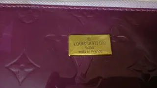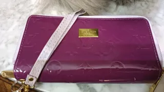Borsa elegante stile Louis Vuitton con un vivace finitura viola e dettagli dorati. Design con monogramma inciso. Include maniglia e chiusura con cerniera.