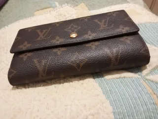 Portafoglio della prestigiosa marca Louis Vuitton. Design classico in colore marrone. Chiusura con bottone dorato.