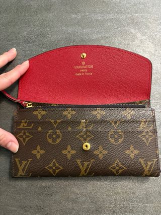 Elegante portafoglio Louis Vuitton con il classico motivo monogramma. - Chiusura con bottone a pressione. - Dettaglio in pelle rossa. - Design compatto e funzionale.