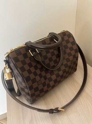 Borsa Louis Vuitton Speedy 30 originale in tela Damier Ebene. Modello iconico, resistente e molto pratico per l'uso quotidiano. L'esterno si presenta in buone condizioni generali, con la tela ben conservata e che mantiene la sua forma. Le maniglie presentano un leggero scolorimento dovuto all'uso, cosa comune per questo modello. Presenta alcune crepe sulla pelle (vedi foto) e l'interno mostra segni d'uso con macchie visibili, tutto ciò è riflesso nel prezzo. Include: fodera originale Louis Vuitton, lucchetto e chiave. Initziali 'O.N' discrete sul lato. Incluso il biglietto d'acquisto di Louis Vuitton. Il prezzo è adeguato allo stato.