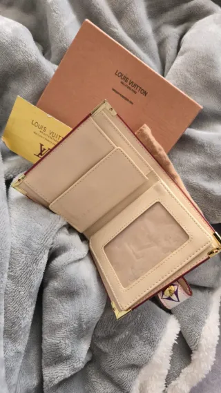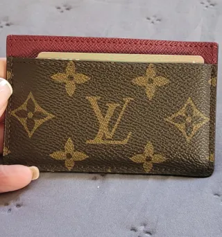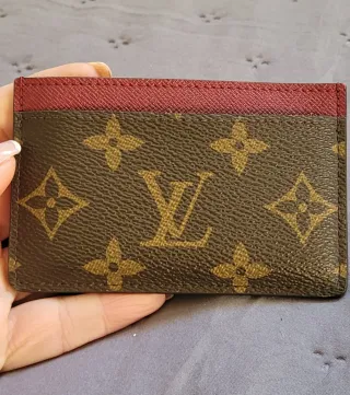 Elegante portacartellini con l'iconico motivo di Louis Vuitton. Design bicolore in marrone e rosso. Materiale di alta qualità.