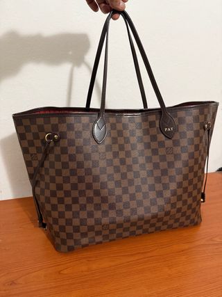 Iconica borsa Louis Vuitton modello Neverfull in tela Damier Ebene. Presenta le iniziali PAT impresse. - Tela Damier Ebene. - Finiture in vacchetta. - Interno in tessuto rosso. - Chiusura con laccio e gancio. - Tasca interna con zip.