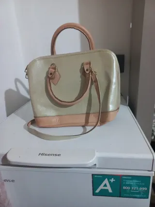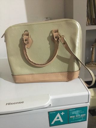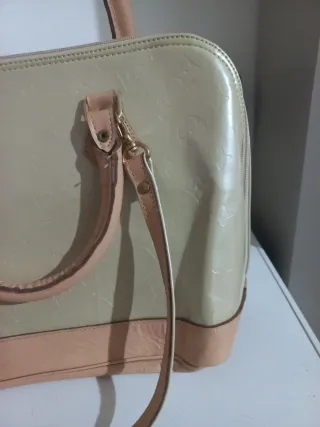 Borsa Louis Vuitton con finiture in pelle. - Colore beige con dettagli marrone. - Materiale verniciato. - Manici arrotondati.