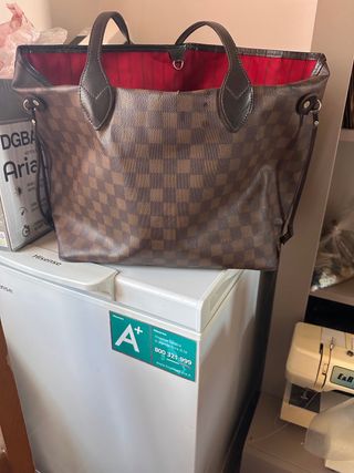 Borsa Louis Vuitton con il classico motivo a scacchiera. - Motivo a scacchiera marrone. - Manici in pelle. - Dettagli in metallo.