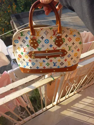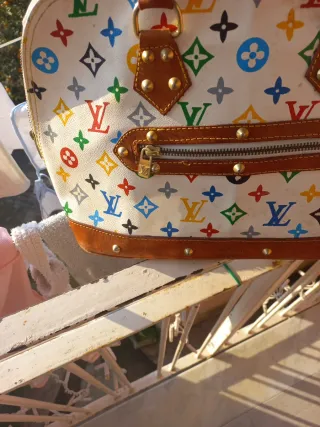 Borsa Louis Vuitton con un vivace design multicolor su sfondo bianco. - Iconico monogramma LV. - Dettagli in pelle marrone. - Zip frontale con finiture dorate.
