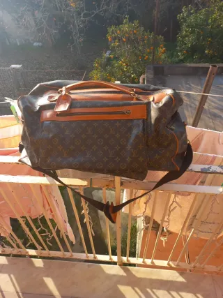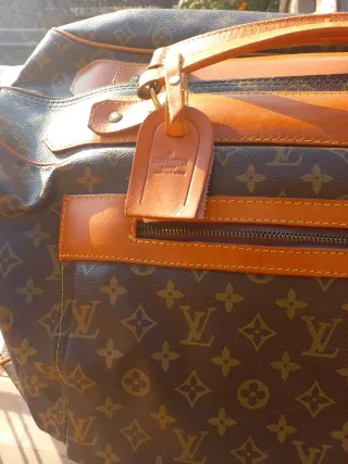 Elegante valigia Louis Vuitton con il classico monogramma. - Dettagli in pelle marrone. - Manici superiori in pelle. - Tracolla regolabile.