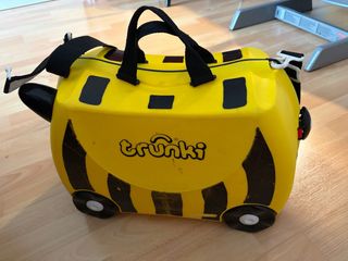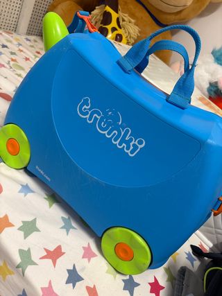 Valigia per bambini Trunki con un divertente design. - Ruote per facilitare il trasporto. - Maniglia per appenderla. - Chiusura di sicurezza. Presenta alcuni graffi laterali dovuti all'uso.