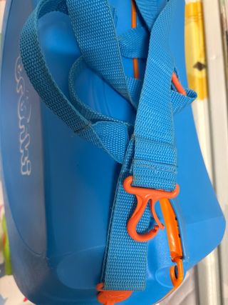 È una valigia con ruote progettata per i bambini, con la forma di un cane blu. Può essere utilizzata per far sedere e spostare i bambini o per trasportare i loro effetti personali. Include una cinghia per trascinarla e un'impugnatura per facilitarne il trasporto. È ideale per i viaggi o per giocare in casa. Questo è il B. Toys On the Go-Go Woofer, anche noto come B. TOYS Valigia Go-Go Ride-On Lolo.