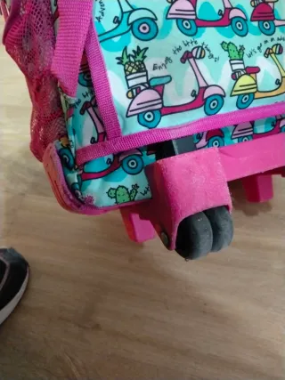 Zaino infantil con un divertido estampado de patinetes. - Diseño multicolor con detalles en rosa. - Ruedas para facilitar su transporte.