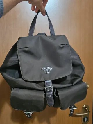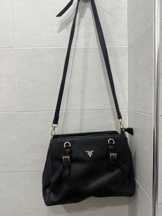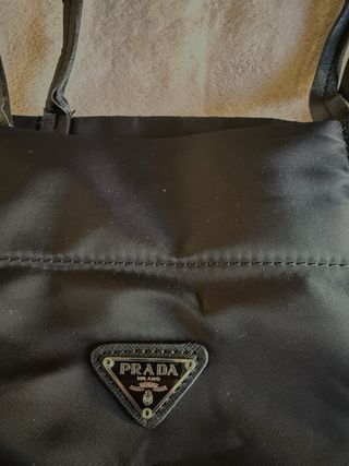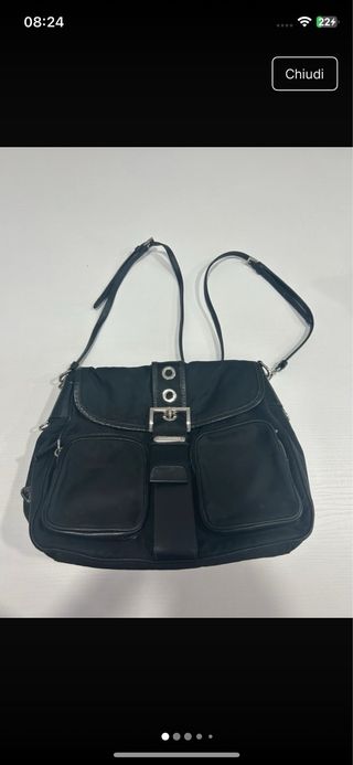 Borsa a spalla Prada in tessuto nero, con dettagli in pelle e fibbia metallica. - Chiusura con patta. - Tasche frontali. - Tracolla regolabile. la borsa è un po’ strappata si deve portare da un calzolaio e la a giusta X il resto è perfetto