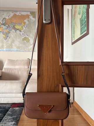 Borsa Prada in pelle marrone, con tracolla regolabile e manici. - Logo triangolare in metallo sul davanti. - Chiusura superiore con zip. - Tasca interna. - Tracolla in tessuto regolabile e rimovibile. - Manici superiori in pelle.