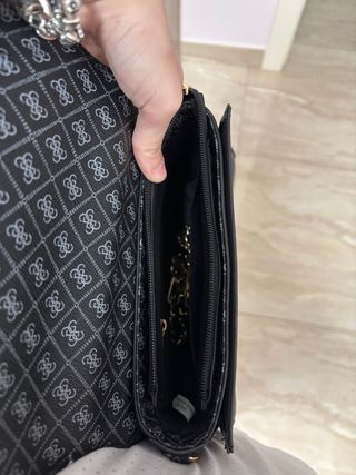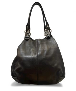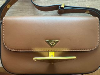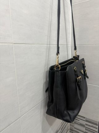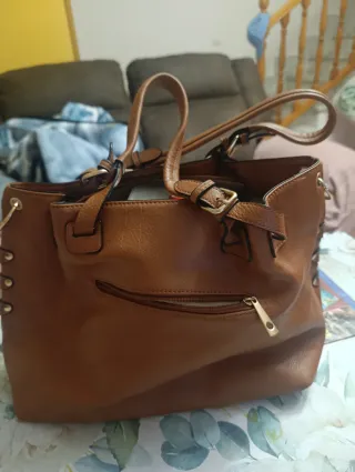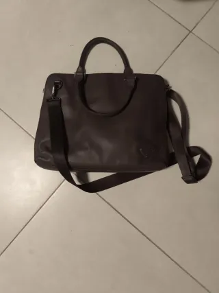 Borsa elegante con un design sofisticato. Realizzata in pelle sintetica testurizzata, presenta dettagli metallici dorati sulla parte frontale. Comode maniglie per il trasporto a mano o a spalla. Include anche una cinghia per il trasporto a tracolla.
