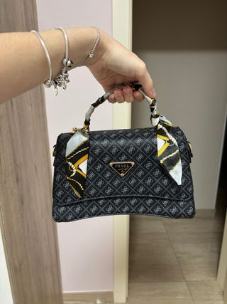 Borsa elegante del marchio Prada con un design accattivante. (Fals) Combinazione di colori nero e multicolore. Manico decorato con un fazzoletto stampato.