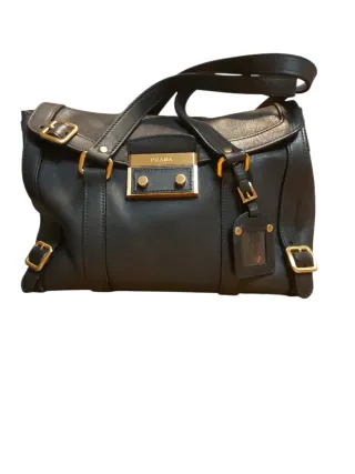Elegante borsa a spalla Prada in pelle nera. Un accessorio versatile e raffinato. Un design semplice ma senza tempo che definsce queato gioiello. Questa borsa Prada è realizzata in morbida pelle nera e rifinita con dettagli in metallo dorato. La chiusura dorata si apre su un capiente interno in tessuto Jacquard. I lunghi manici superiori la rendono comoda da portare a spalla oppure a mano. - Dettagli in metallo dorato. - Chiusura con fibbia. - Tracolla regolabile. - Targhetta porta documenti.
