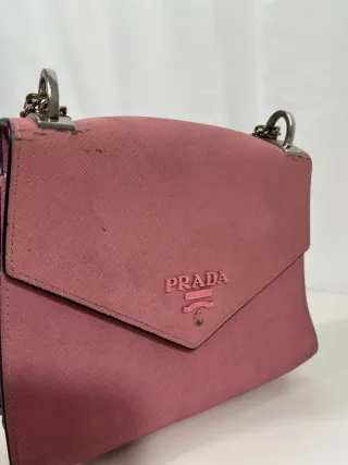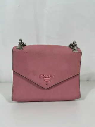 Elegante borsa a mano Prada in colore rosa. Design con patta e chiusura. Catenella metallica per il trasporto a spalla. Logo del marchio in rilievo.