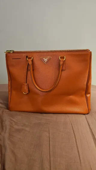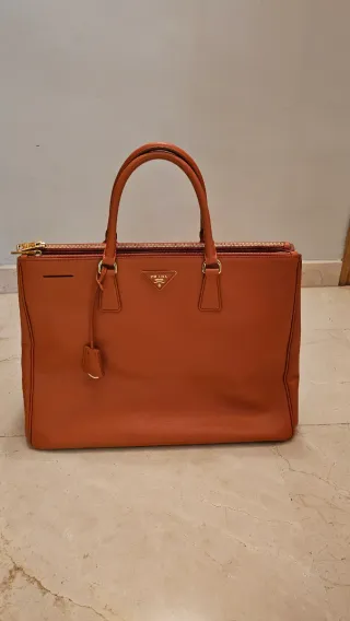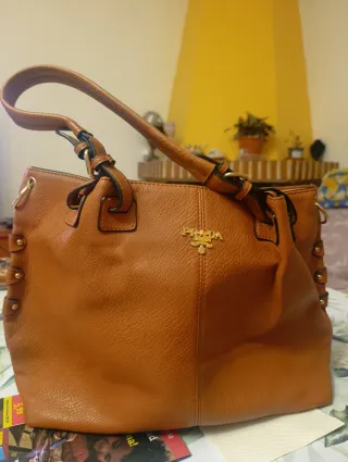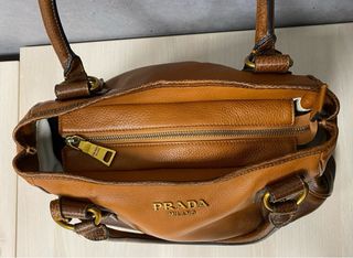 Borsa Prada Bauletto realizzata con pelle morbida color caramello con il logo Prada con lettere metalliche in evidenza al centro. Con due manici in pelle e una tracolla intrecciata rimovibile e regolabile che permettono di portarla come borsa a mano, a spalla o a tracolla. Utilizzata solo due volte. Senza segni d'uso e in perfette condizioni. Include borsa del negozio e fodera protettiva. NON TRATTABILE. È possibile visionare senza impegno per verificare l'autenticità.
