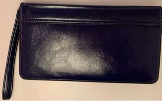 Borsa a mano elegante con finitura brillante. Design a busta. Logo metallico del marchio. Cinturino da polso.