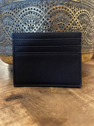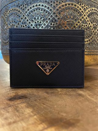 Elegante portacarte Prada in pelle nera. É imitazione ma é di alta qualità. Spedizione veloce 🚚 - Logo triangolare Prada in metallo dorato. - Diverse fessure per carte di credito. - Design compatto e raffinato.