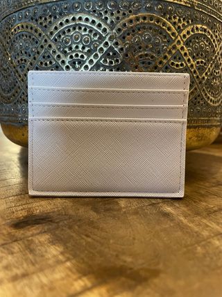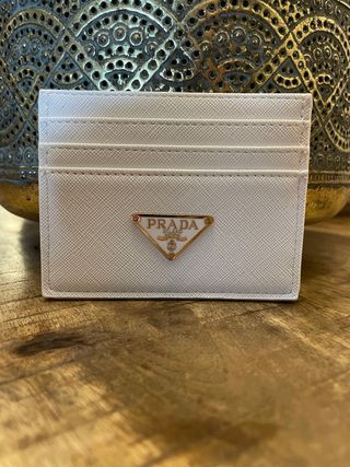 Elegante portacartellini del marchio Prada. Design in bianco. Dettaglio metallico dorato con il logo del marchio.