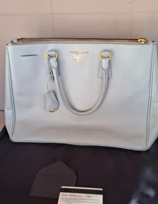 Splendida borsa Prada Galleria in pelle saffiano, colore carta da zucchero. Buone condizioni generali, segni visibili in foto negli angoli e sulla parte inferiore. Interno pulito. Completa di dustbag e cartellini di autenticità
