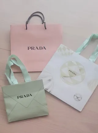 Set di tre borse regalo del marchio PRADA. - Borsa grande in rosa con cordone nero - Borsa media in bianco con design dorato in rilievo e manici verdi - Borsa piccola in verde, con manici verdi. Include carta e nastro nero per avvolgere un piccolo regalo. Ideale per i tuoi regali di questo Natale. Prezzo per tutto il lotto, non vendute separatamente