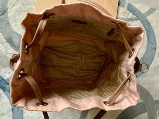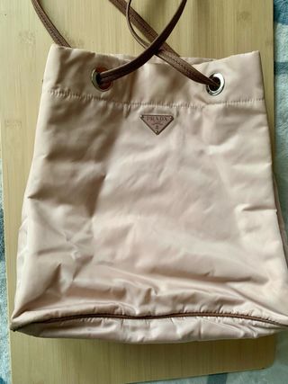 Borsa Prada in tessuto rosa. - Logo triangolare Prada. - Coulisse con occhielli metallici. - Tracolla in pelle marrone.