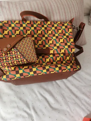 Set di borsa e portafoglio con un design vivace e originale. Stampa geometrica multicolore. Dettagli in pelle marrone. Chiusura con patta e bottoni a pressione nel portafoglio.