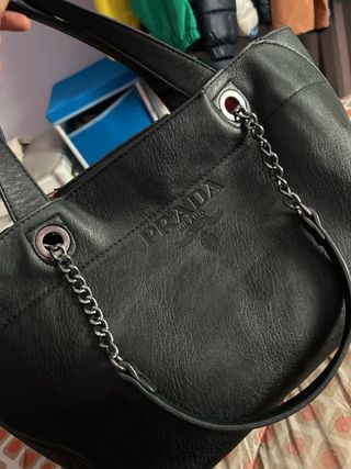 Borsa a mano Prada in pelle nera con dettagli a catena. Design elegante e versatile. Finitura testurizzata della pelle. Chiusura con catena metallica.