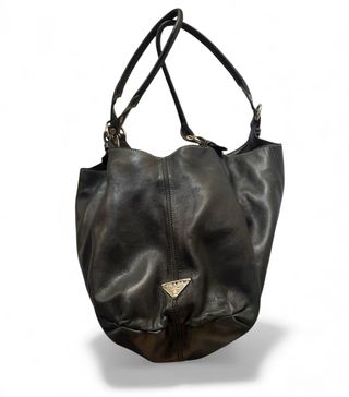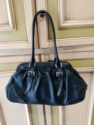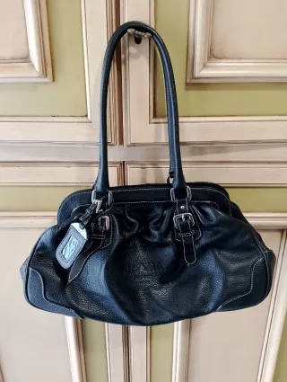 Borsa vintage Prada degli anni '90, versatile da portare a mano o a spalla. Misura 37 cm di larghezza, 15 cm di altezza, l'impugnatura è lunga 24 cm, il logo Prada è inciso sui hardware, la borsa è in ottime condizioni, senza rotture, sfregamenti, macchie o difetti. Design classico ed elegante. Chiusura con bottone a pressione. Dettaglio metallico frontale.