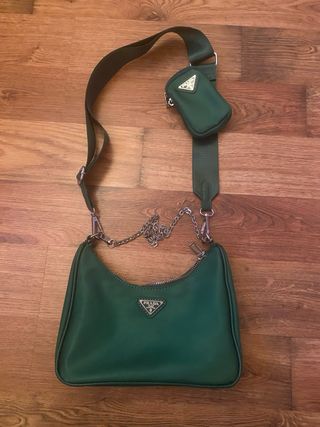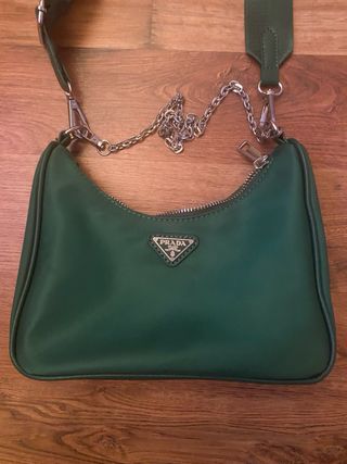Borsa a mano Prada in colore verde con dettagli a catena. Design moderno ed elegante. Manico in catena metallica. Chiusura con cerniera.